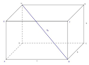 ist die Hypotenuse (=längste Seite) des rechtwinkeligen Dreiecks, die Höhe (h) sowie die Flächendiagonale der Grundfläche